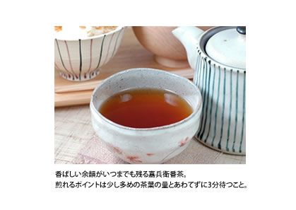 また山間部の冷涼な気候を利用して 出てきた芽には一度も農薬を散布しない という方法をとっており美味しく飲めて しかも安心 嘉兵衛本舗のうれしい心配りです。